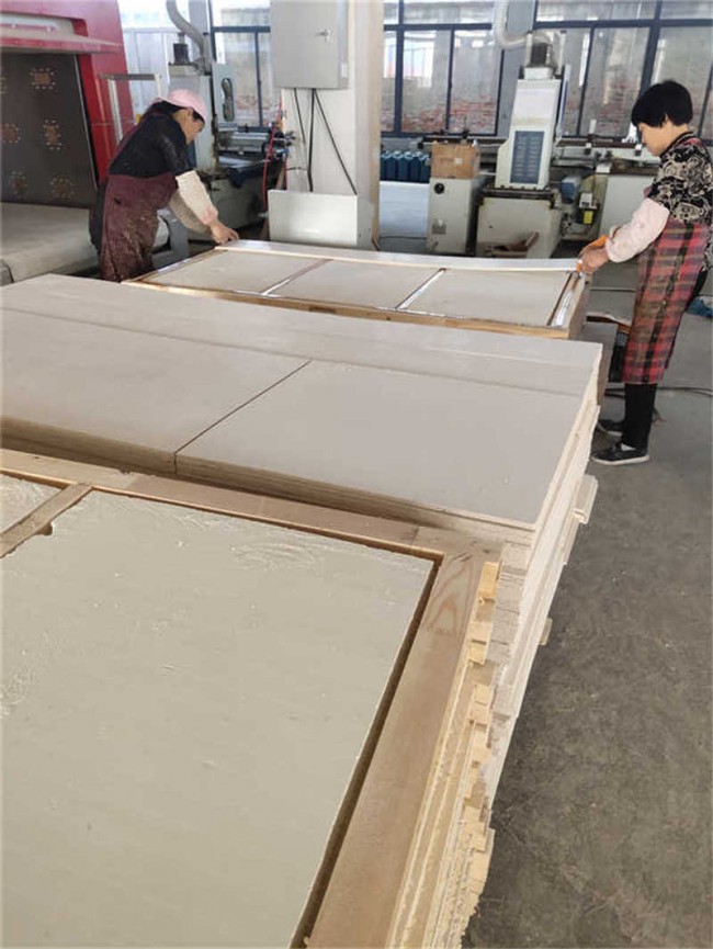 2)門扇骨架:選用阻燃處理的杉木為基材,采用“L”型和“T”型連接,由二根木骨架冒頭料、二根木骨架挺料、四根木骨架間隔料及一根鎖托組成,突出了木骨架框架的整體結(jié)構(gòu)強(qiáng)度。木料之間的拼縫需嚴(yán)實(shí)平整,木骨架邊框和橫楞在同一平面,面層、邊框及橫楞加壓膠結(jié),在橫楞和上、下冒頭各鉆三個透氣孔,以防受潮脫膠或起鼓。